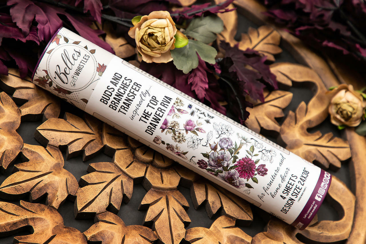 Buds and Branches transfer has been designed to apply as a whole or to be split into multiple pieces. The black overlay buds can be layered and built onto the flowers.