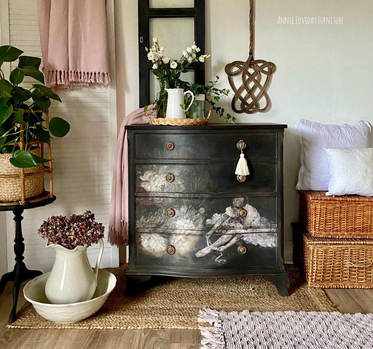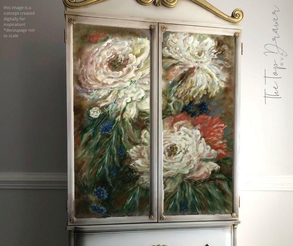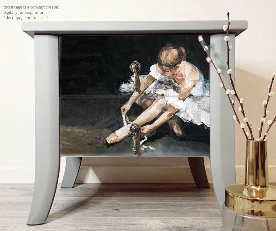 Simply apply Dixie Belle Clear Coat to the area where you want to place the decoupage paper. Apply the Rice Decoupage Paper to the wet clear coat and then apply another coat of Dixie Belle Clear Coat on top of the Rice Decoupage Paper. Allow to dry completely.