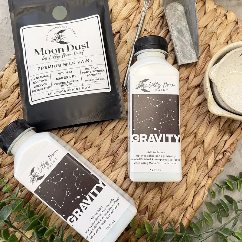 Gravity Bonding Agent is an easy and simple to use product. It is a water-based, V.O.C. free, low odor, non-toxic additive for Moon dust milk paint that greatly improves adhesion to non-porous surfaces including close-grained hardwoods.