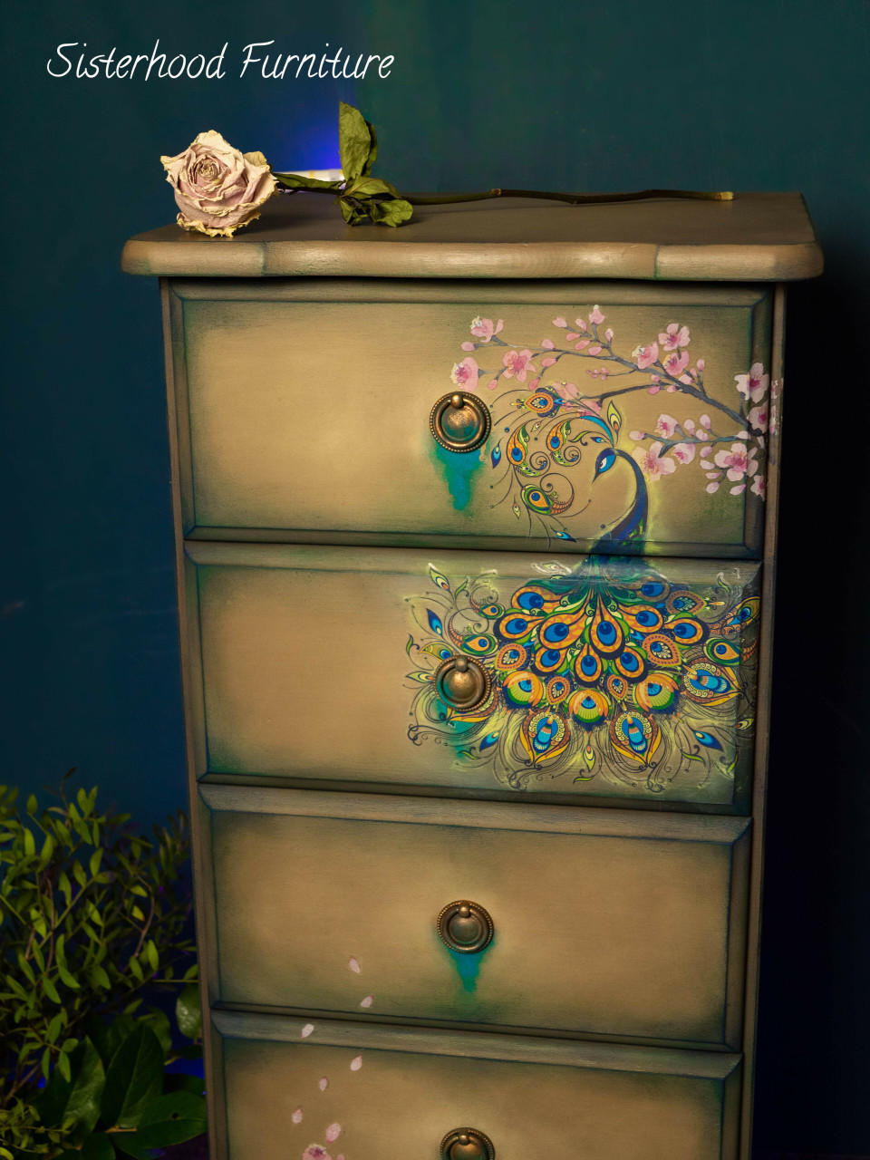 Bold yet soft colored feathers swirling around your piece will bring it to life. Tall tail quill feathers spread across to give your furniture an essence of life.